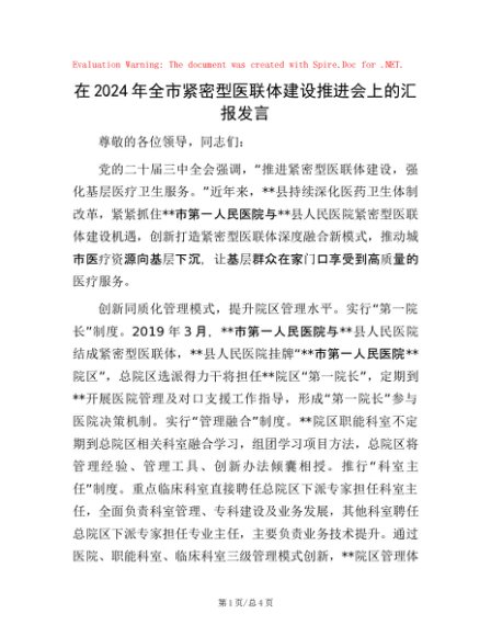 / 在2024年全市紧密型医联体建设推进会上的汇报发言