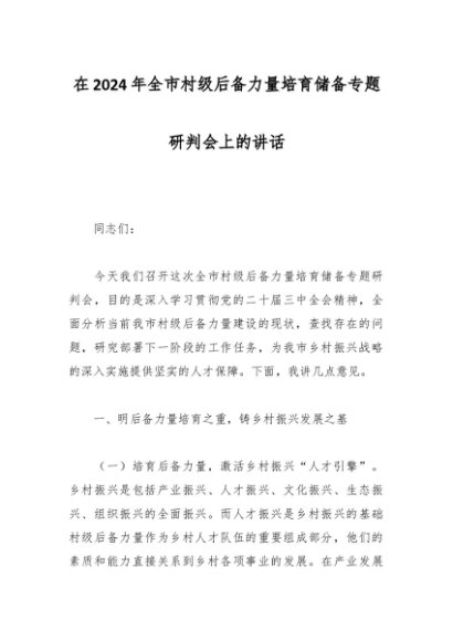 / 在2024年全市村级后备力量培育储备专题研判会上的讲话