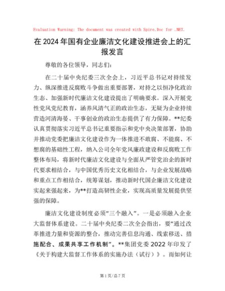 / 在2024年国有企业廉洁文化建设推进会上的汇报发言