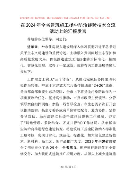 / 在2024年全省建筑施工扬尘防治经验技术交流活动上的汇报发言