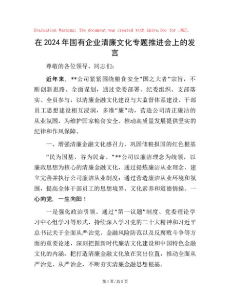 / 在2024年国有企业清廉文化专题推进会上的发言
