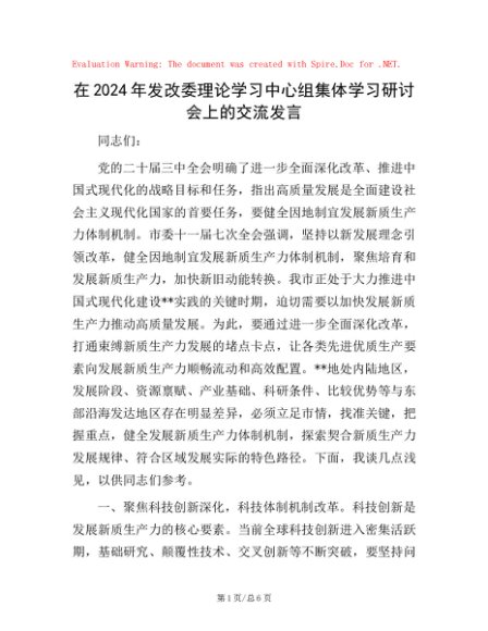 / 在2024年发改委理论学习中心组集体学习研讨会上的交流发言