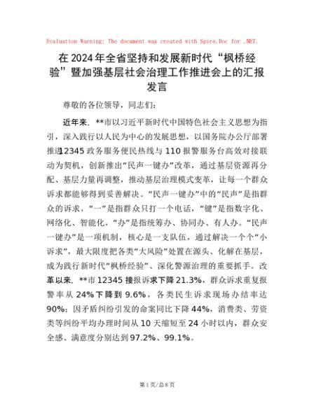 / 在2024年全省坚持和发展新时代“枫桥经验”暨加强基层社会治理工作推进会上的汇报发言