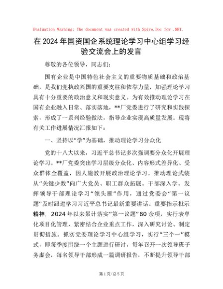 / 在2024年国资国企系统理论学习中心组学习经验交流会上的发言