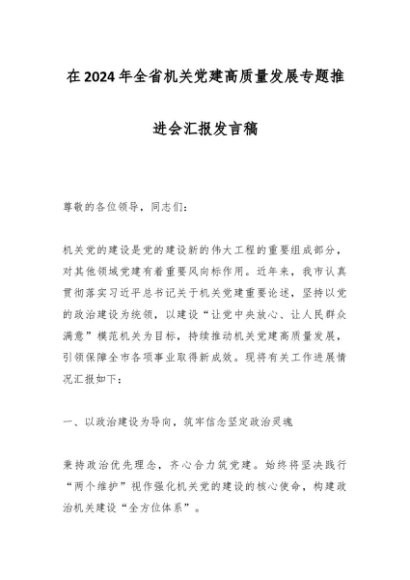 / 在2024年全省机关党建高质量发展专题推进会汇报发言稿