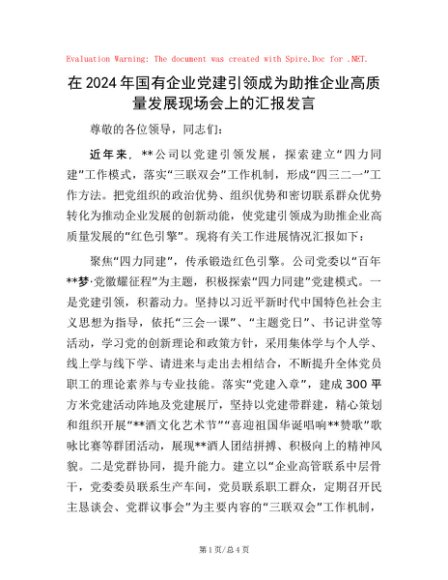 / 在2024年国有企业党建引领成为助推企业高质量发展现场会上的汇报发言
