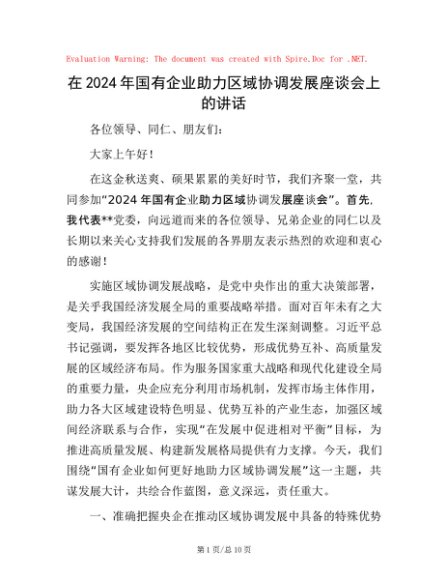/ 在2024年国有企业助力区域协调发展座谈会上的讲话