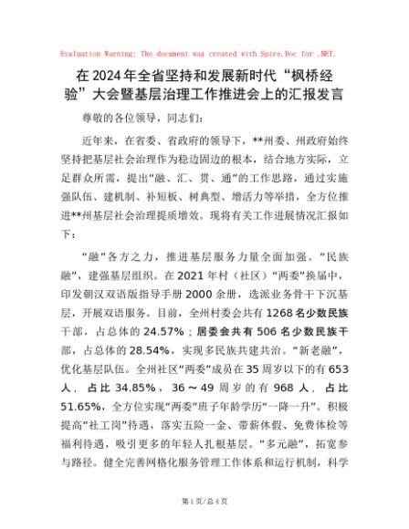 / 在2024年全省坚持和发展新时代“枫桥经验” 大会暨基层治理工作推进会上的汇报发言