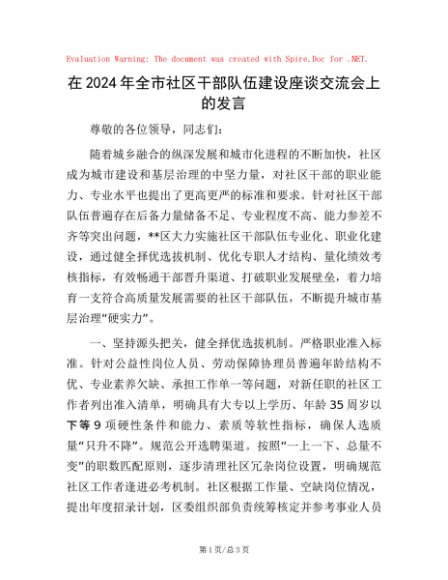 / 在2024年全市社区干部队伍建设座谈交流会上的发言