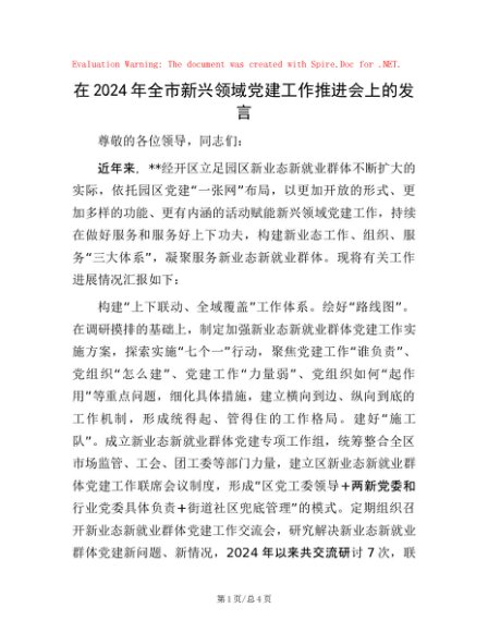 / 在2024年全市新兴领域党建工作推进会上的发言