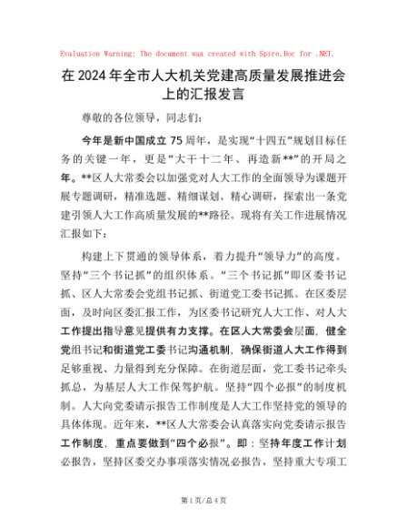 / 在2024年全市人大机关党建高质量发展推进会上的汇报发言