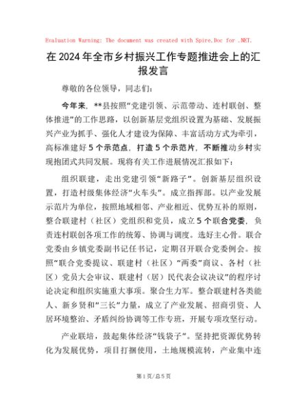 / 在2024年全市乡村振兴工作专题推进会上的汇报发言
