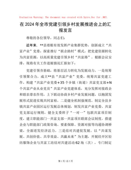 / 在2024年全市党建引领乡村发展推进会上的汇报发言