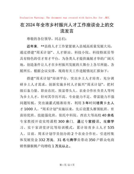 / 在2024年全市乡村振兴人才工作座谈会上的交流发言