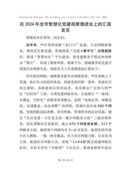 / 在2024年全市智慧化党建观摩推进会上的汇报发言