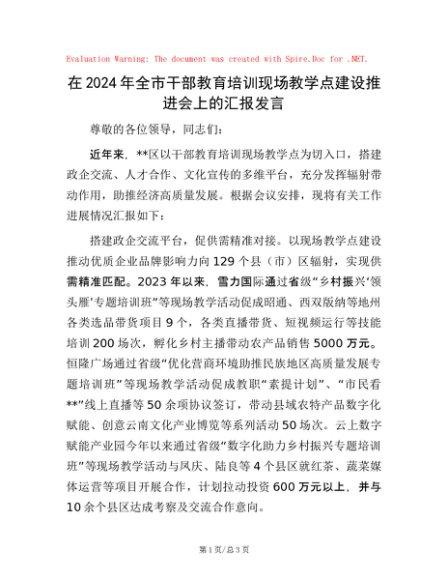 / 在2024年全市干部教育培训现场教学点建设推进会上的汇报发言