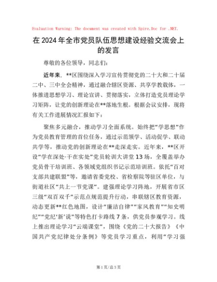 / 在2024年全市党员队伍思想建设经验交流会上的发言