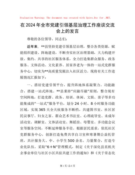 / 在2024年全市党建引领基层治理工作座谈交流会上的发言