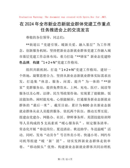 / 在2024年全市新业态新就业群体党建工作重点任务推进会上的交流发言