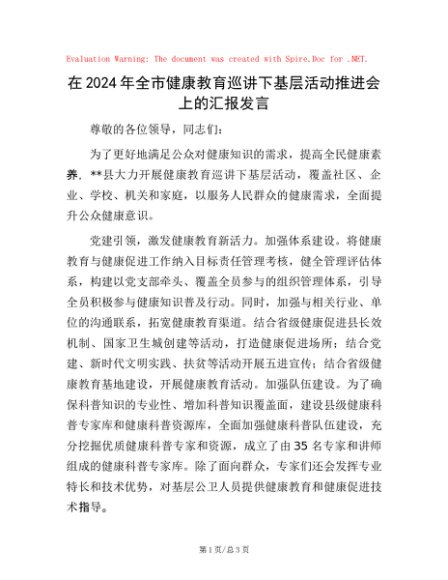 / 在2024年全市健康教育巡讲下基层活动推进会上的汇报发言