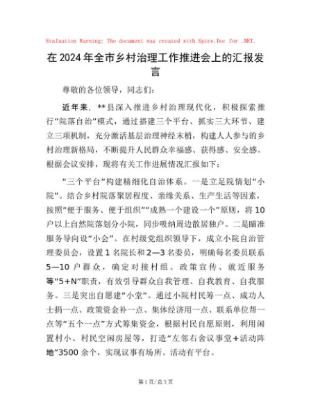 / 在2024年全市乡村治理工作推进会上的汇报发言