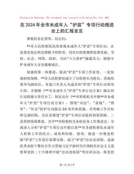 / 在2024年全市未成年人“护苗”专项行动推进会上的汇报发言