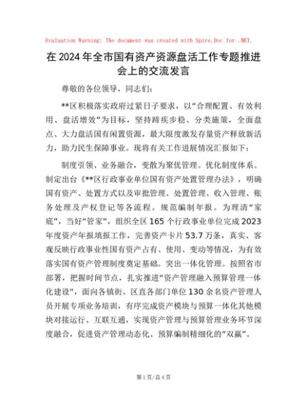 / 在2024年全市国有资产资源盘活工作专题推进会上的交流发言