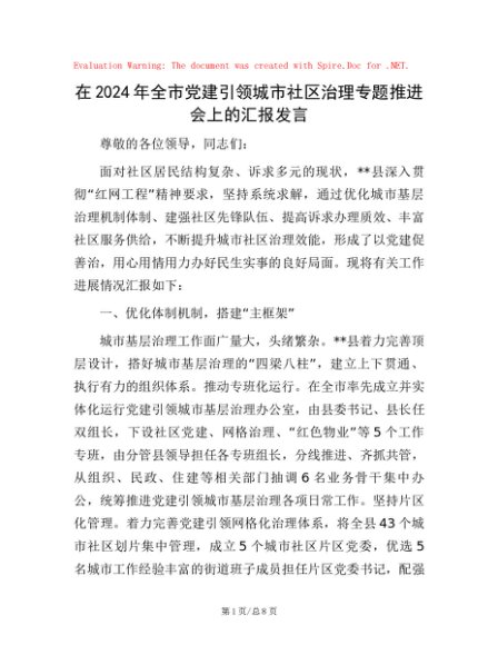 / 在2024年全市党建引领城市社区治理专题推进会上的汇报发言
