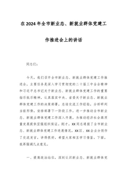 / 在2024年全市新业态、新就业群体党建工作推进会上的讲话