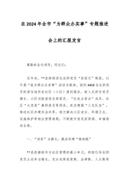 / 在2024年全市“为群众办实事”专题推进会上的汇报发言