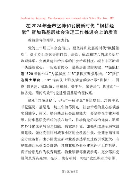 / 在2024年全市坚持和发展新时代“枫桥经验”暨加强基层社会治理工作推进会上的发言