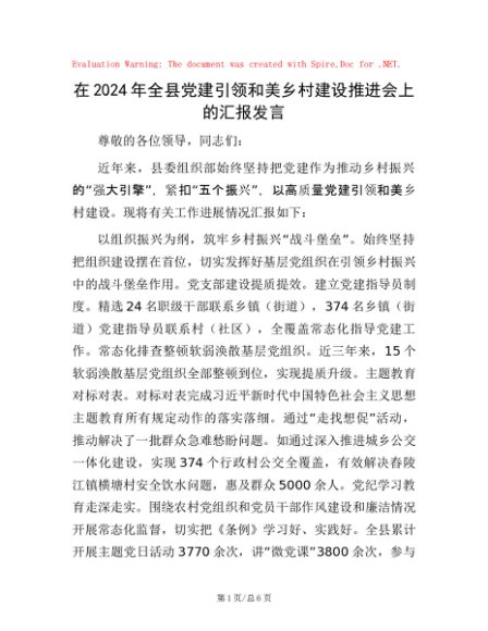 / 在2024年全县党建引领和美乡村建设推进会上的汇报发言