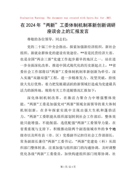 / 在2024年“两新”工委体制机制革新创新调研座谈会上的汇报发言