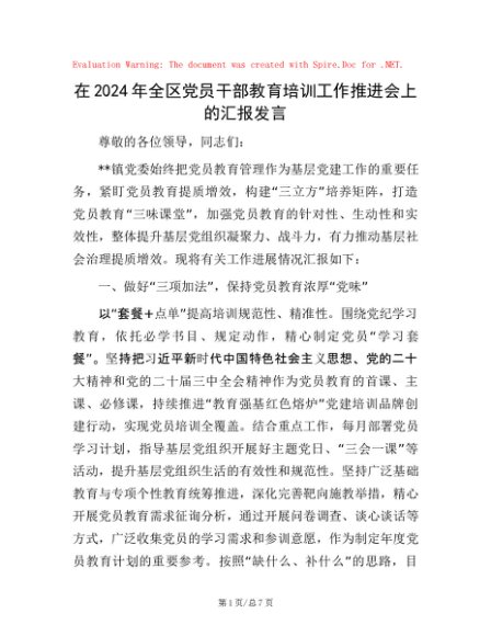 / 在2024年全区党员干部教育培训工作推进会上的汇报发言