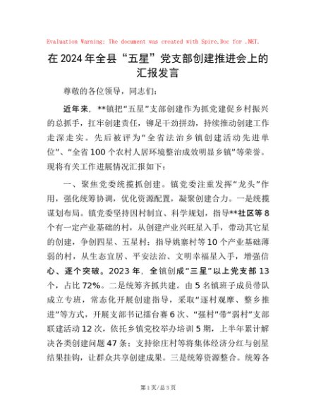 / 在2024年全县“五星”党支部创建推进会上的汇报发言