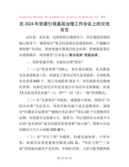 / 在2024年党建引领基层治理工作会议上的交流发言