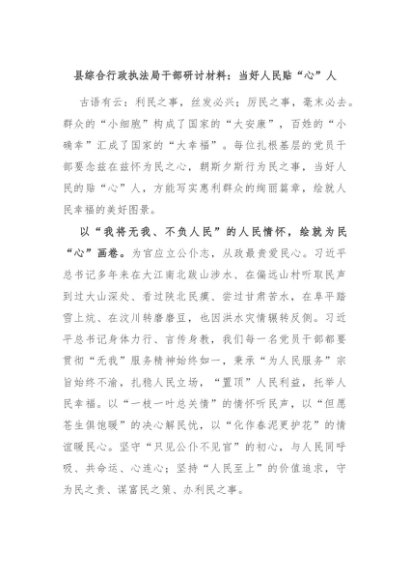 / 县综合行政执法局干部研讨材料:当好人民贴“心”人
