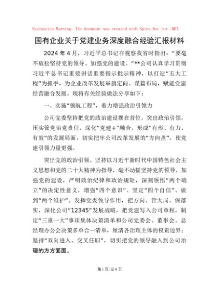 / 国有企业关于党建业务深度融合经验汇报材料