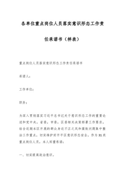 / 各单位重点岗位人员落实意识形态工作责任承诺书(样表)