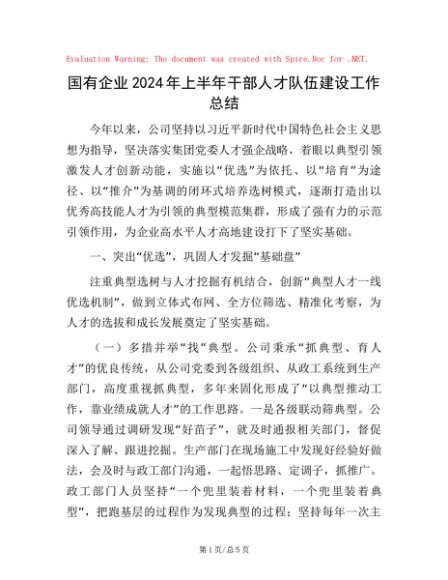 / 国有企业2024年上半年干部人才队伍建设工作总结
