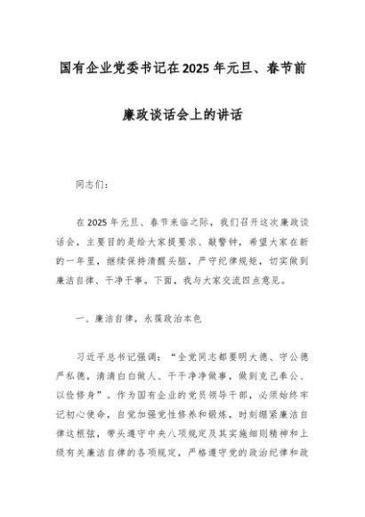 / 国有企业党委书记在2025年元旦、春节前廉政谈话会上的讲话