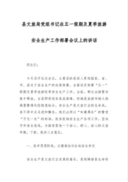 / 县文旅局党组书记在五一假期及夏季旅游安全生产工作部署会议上的讲话