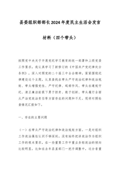 / 县委组织部部长2024年度民主生活会发言材料(四个带头)