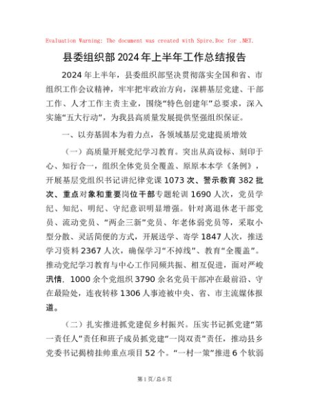 / 县委组织部2024年上半年工作总结报告