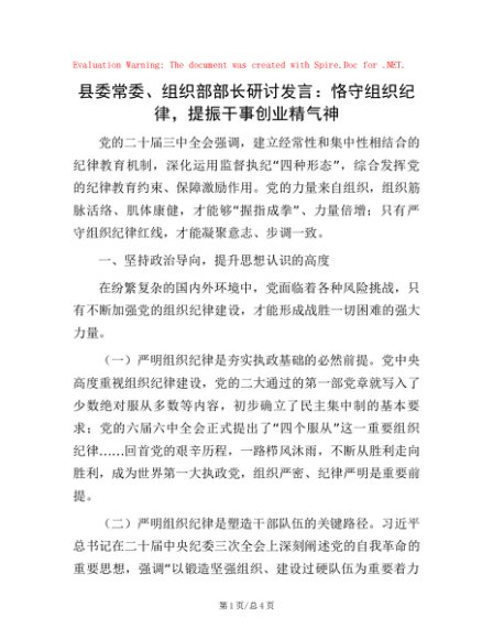 / 县委常委、组织部部长研讨发言:恪守组织纪律,提振干事创业精气神