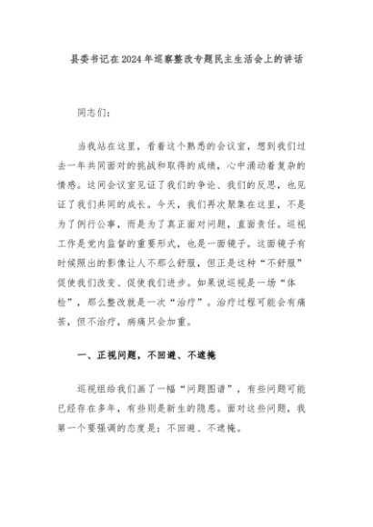 / 县委书记在2024年巡察整改专题民主生活会上的讲话