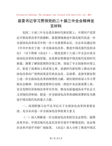 / 县委书记学习贯彻党的二十届三中全会精神发言材料