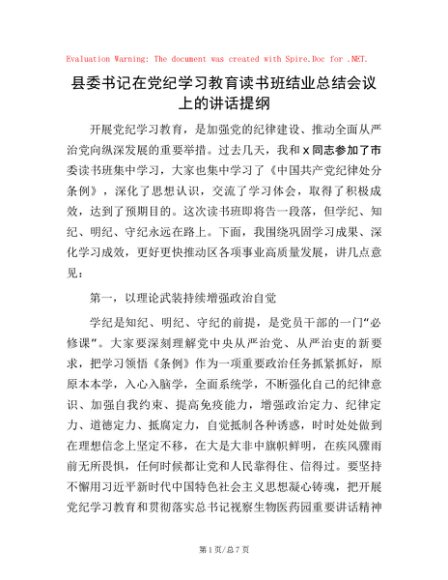 / 县委书记在党纪学习教育读书班结业总结会议上的讲话提纲