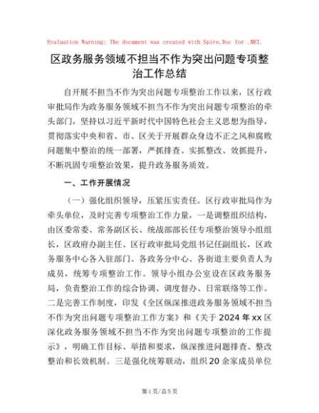 / 区政务服务领域不担当不作为突出问题专项整治工作总结