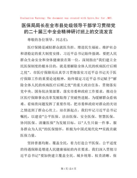 / 医保局局长在全市县处级领导干部学习贯彻党的二十届三中全会精神研讨班上的交流发言